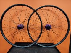 Custom wheels, 29'', Race Face Vault hubs, purple, Sram XD, 148mm rear, 110mm front, 6 bolts, Stans No Tube Flow EX3 rims, 29mm internal.